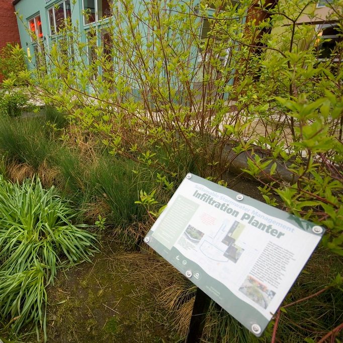 An infiltration planter is a green asset designed to capture stormwater and infiltrate it directly into the ground. Oftentimes, infiltration planters are made with bricks or concrete and do not have a base. They work by slowing down stormwater runoff, most often from impervious surfaces, to allow pollutants to naturally filter before absorbing into the ground soil. Learn more about Infiltration Planters here.